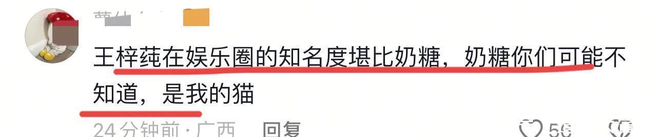 也不知道这姐们儿怎么敢耍这么大的牌,这知名度跟我差不多,咋敢给自己划花里面去呢?网友调侃:王梓莼在娱乐圈的知名度堪比奶糖,奶糖你们可能不知道,是我的猫。