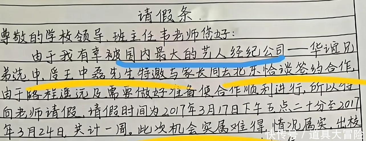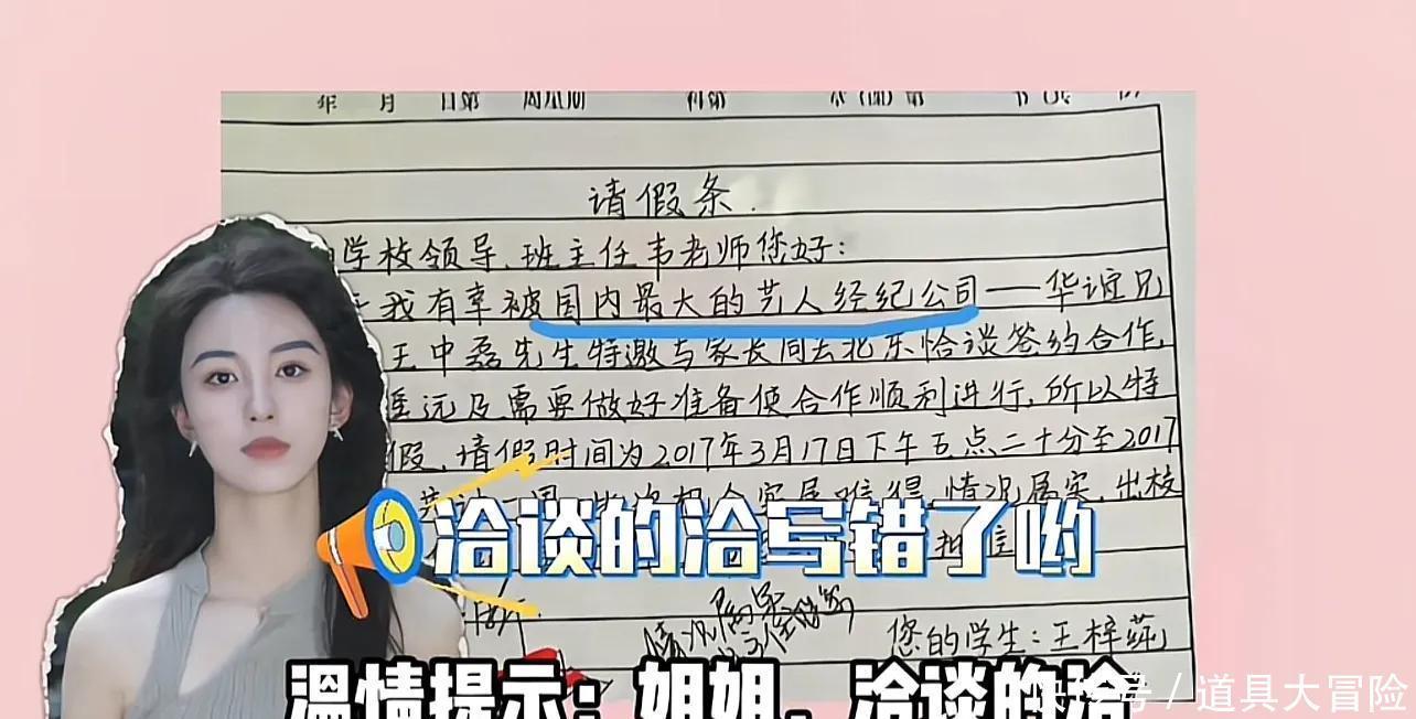 “绿茶哥”从什么时候开始狂的不知道,但是“公关姐”应该是从小就开始狂的吧。从一个请假条就能看出来。说什么“国内最大的艺人经纪公司受王中磊先生特邀,洽谈签约合作是机会属实难得。知道的是高中请假条,不知道的还以为要见国王呢。